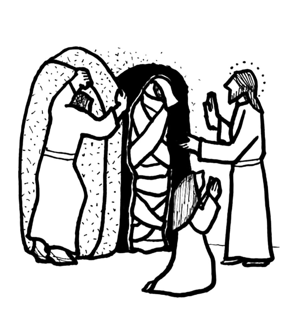 マルタに代わってマリアがイエスと対面します。マリアもマルタと同じように「主よ、もしここにいてくださいましたら、わたしの兄弟は死ななかったでしょうに」とやはり悲しみに打ちひしがれ、集まった人たちと一緒に泣いています。死は人間に絶望と悲しみをもたらします。ここでイエスは憤ったり、興奮したり、涙を流したりというように人間的な感情をあらわにします。自身の十字架の死を意識してのことなのでしょうか。ラザロを生き返らせる奇跡を通して示された神の栄光は、イエスの十字架の死と復活によって頂点に達します。イエスは命を与えることができるお方だと悟った人たちは信仰へと導かれます。「イエスのなさったことを目撃したユダヤ人の多くは、イエスを信じた」と本日の福音は結ばれています。