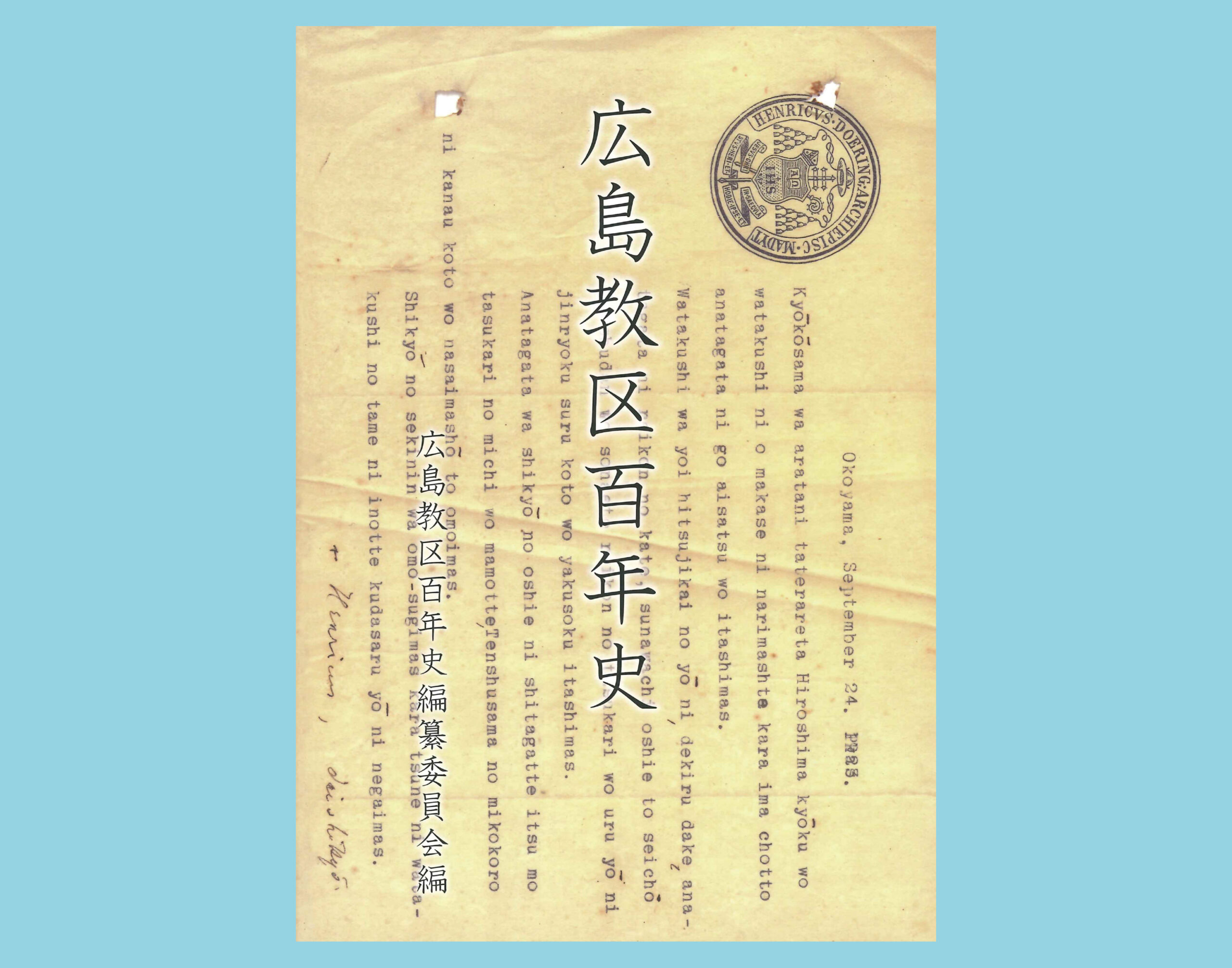 巻頭の「はじめに」によれば、今日まで教区史と呼ばれるものは幾度も編まれてきたが、その全てが残されているわけではない。今後も史資料の散逸が予測されるため、広島教区として「ひとまず出来事と経緯が忘却されないようにまとめ、次代に託す必要がある」と考えた。