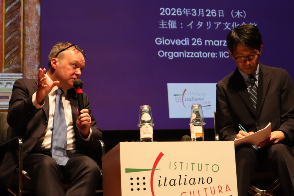 続けて英国・ケンブリッジ大学教授で、イタリア地中海の美術史を専門とするドナル・クーパーさんが、ジョットが大聖堂上堂に描いたフレスコ画とその配置について解説した。ジョットが聖フランシスコにまつわる「聖痕」「小鳥への説教」「死」などの重要な場面を強調し、キリストの生涯との間に類似の関係性をつくり出していること、そして聖フランシスコに、「人類救済」の物語の中の特別な役割を与えていることを説明した。