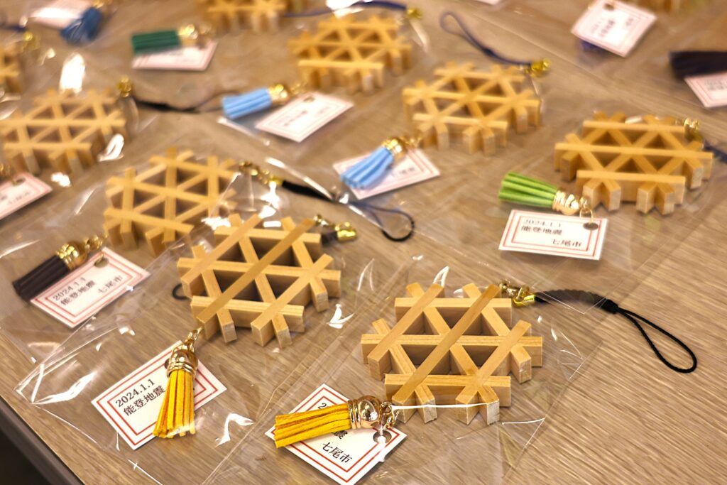 片岡神父は、七尾市田鶴浜(たづるはま)町の建具職人の家族が被災後に町の伝統工芸技術を生かして手作りした「組子(くみこ)ストラップ」(1500円〈送料別〉)を紹介した。ストラップの販売収益は、サポートセンターが協働している七尾市の民間災害ボランティアセンターの活動資金に充てられる。注文はこちらから。