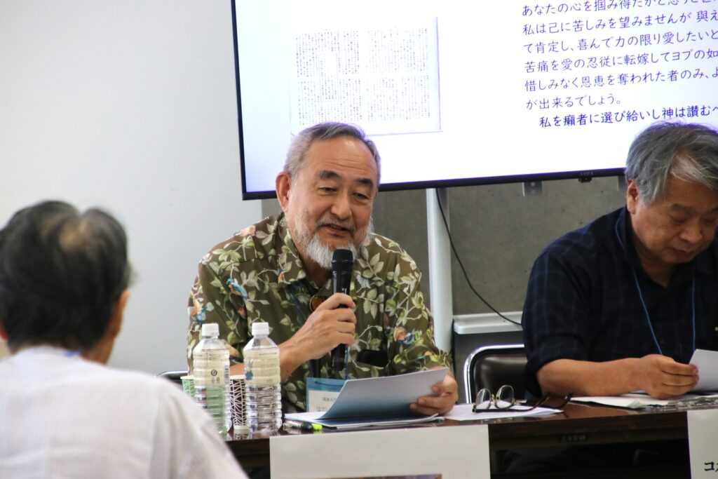 その上で田中さんは、「超自然」への目覚めを表現した詩として、ハンセン病療養者の一人でカトリック信者の東條耿一(こういち/1912~42年)の「病床閑日」を取り上げた。