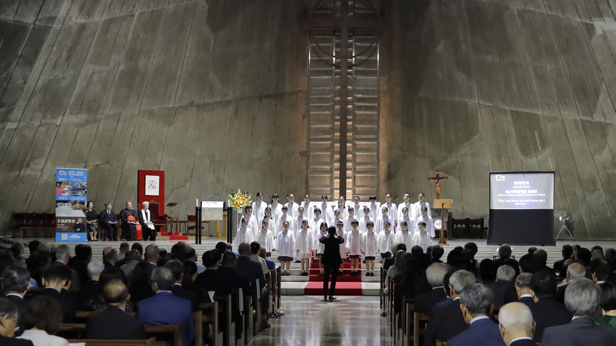 式典では、青山学院初等部聖歌隊の子どもたち33人が「特別賛美」として合唱し、澄んだ歌声を響かせた。