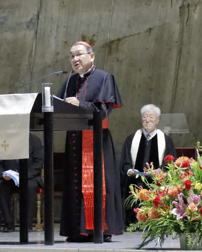式典では、日本聖書協会副理事長を務める菊地功枢機卿(東京教区)が開会あいさつに立った。菊地枢機卿は、聖書を通して神の言葉が日本社会に影響を与え、隣人愛などの共通善に基づく根源的な問いに「光を投げかけてきた」と指摘。聖書普及を担ってきた人々の献身に感謝を表し、またプロテスタントとカトリックが教派を超えて聖書翻訳に取り組んできたことの重要性にも言及した。「これからも闇の中の孤独のうちに沈む多くの人たちに神の言葉が希望をもたらす」ことを願い、引き続き聖書の普及に取り組んでいくと述べた。