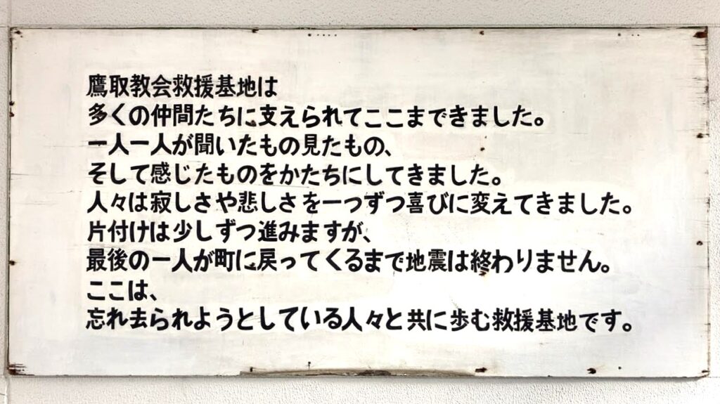 メッセージは、救援基地の取り組みや、人々が「寂しさや悲しさを一つずつ喜びに変えて」きたことなど、進みつつある復興の様子を伝えている。その一方、「最後の一人が町に戻ってくるまで」震災は終わらないと述べる。そして最後に、「ここは、忘れ去られようとしている人々と共に歩む救援基地です」と結ばれている。