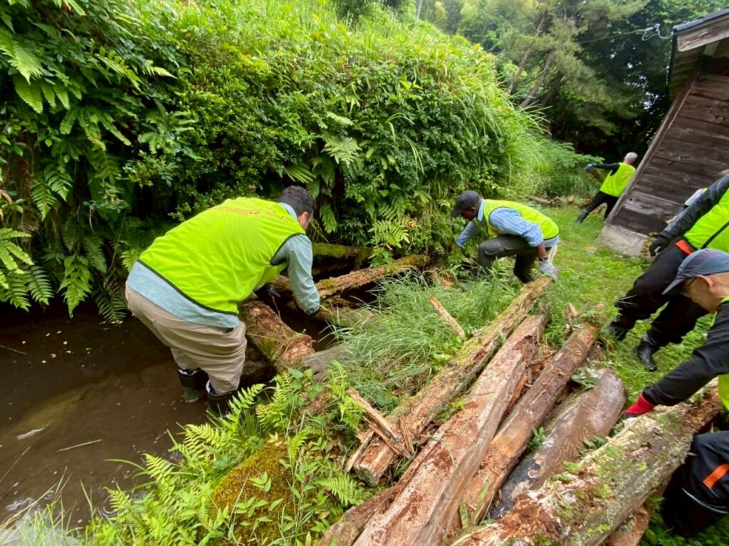 活動初日の7月2日は、のとサポートセンターのスタッフとボランティアが毎週、戸別訪問している輪島市空熊(そらくま)町の一軒家(関連記事はこちら)を訪れ、家主の求めに応えて庭の池に橋をかける作業を行った。