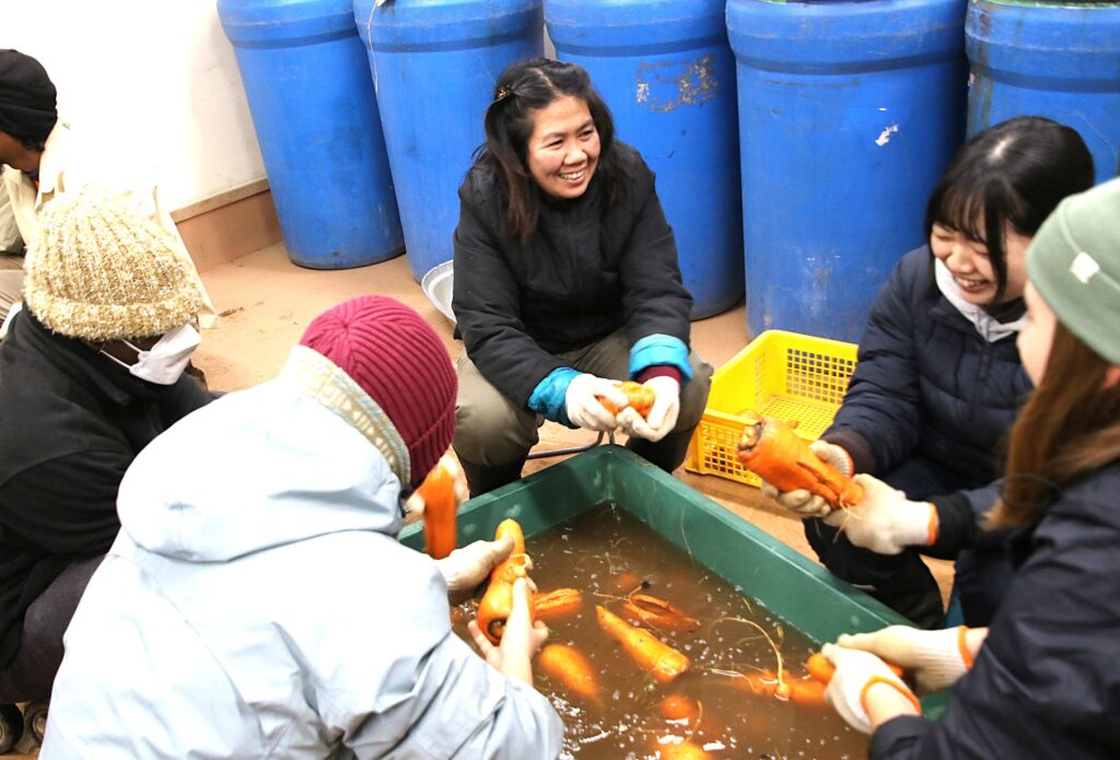国内外からのボランティアと一緒に学院で採れたニンジン