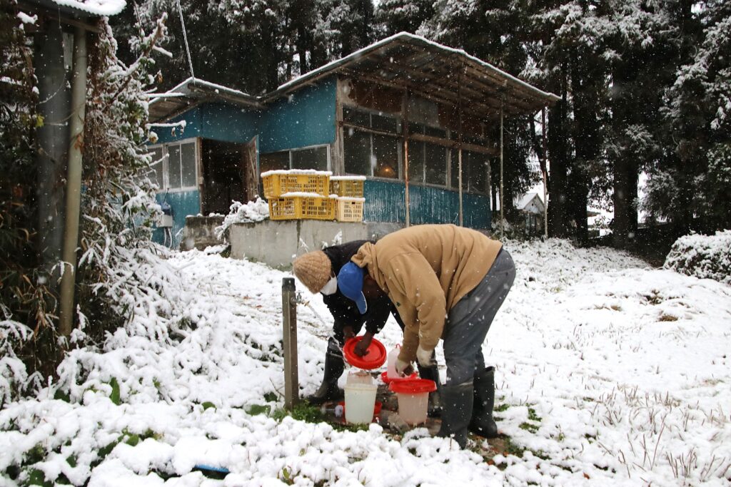 フードライフの作業の一つ。鶏のひなを集めた小屋(写真奥)