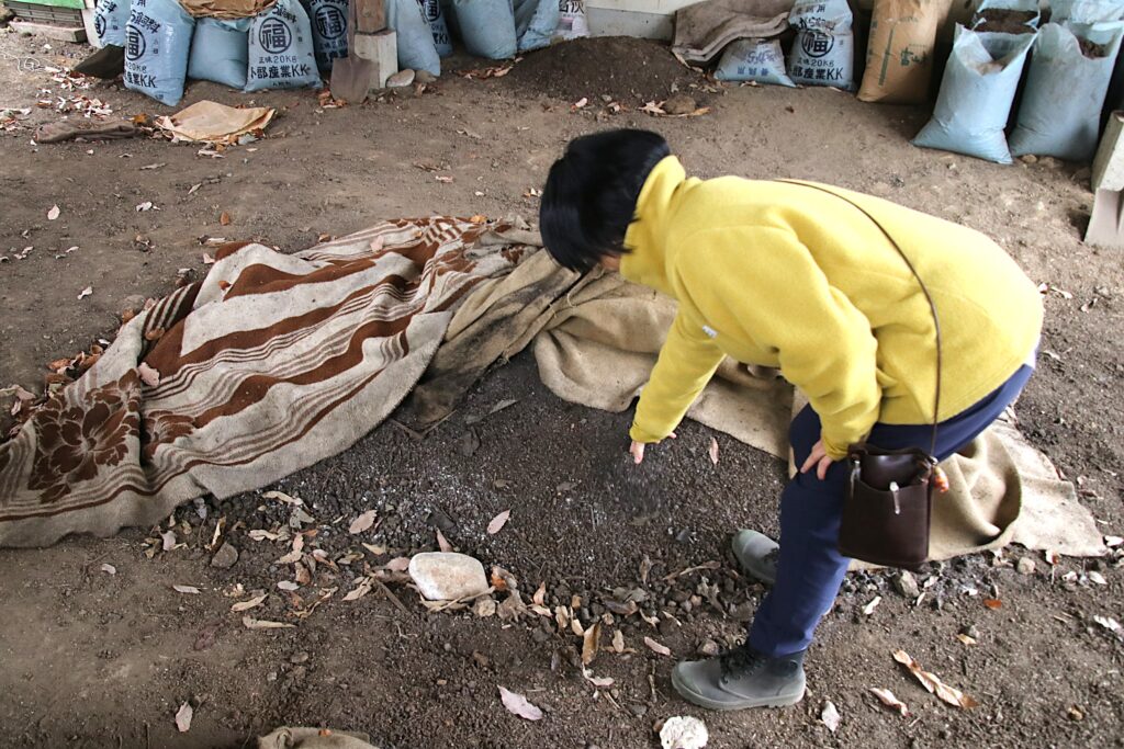 作成途中のぼかしの様子を見る荒川さん。集めた微生物と