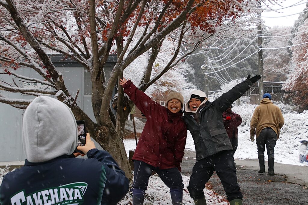 この冬初めての雪が降り、大喜びの学生たち。雪がほとんど