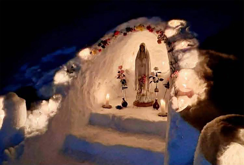 続いて、平和のためにロザリオの祈りを日本語と英語でささげた。その後、聖母像を先頭にろうそくと花を持ち、歌いながら、洞窟に見立てたかまくらまで歩いた後、聖母像を安置して献花し、祈った。翌8日は成井司教主司式のミサが行われた。
