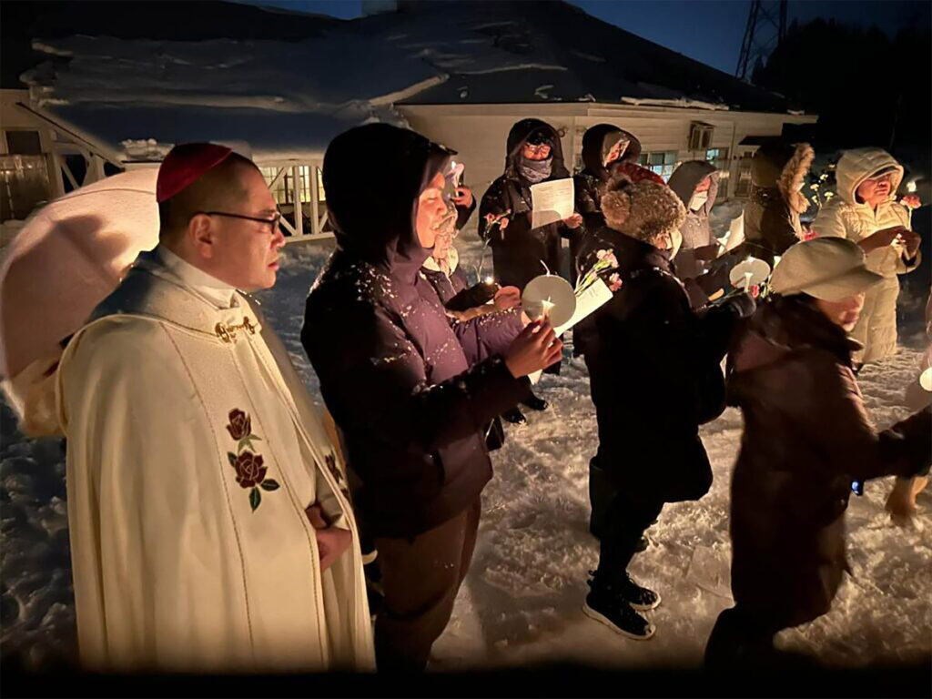 雪の中、ろうそくの光で聖母に祈る「雪の聖母祭」が、新庄教会(巡回/山形県最上郡)で毎年行われている。今年も2月7日と8日、成井大介司教(新潟教区)と信徒30人以上が集い、共に平和を願って祈りをささげた。