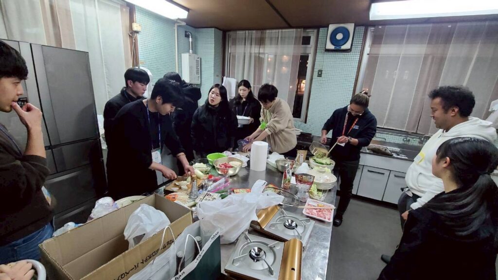 日韓の青年らは2月6日10時に中部国際空港(愛知県常滑〈とこなめ〉市)で合流し、同教区センターに移動。司教館で松浦悟郎司教(同教区)にあいさつし、自己紹介をした。昼食後は名古屋市内の観光と夕食の材料の買い出しに出かけ、夕方から分かち合いとテゼの祈りの時間を持った。