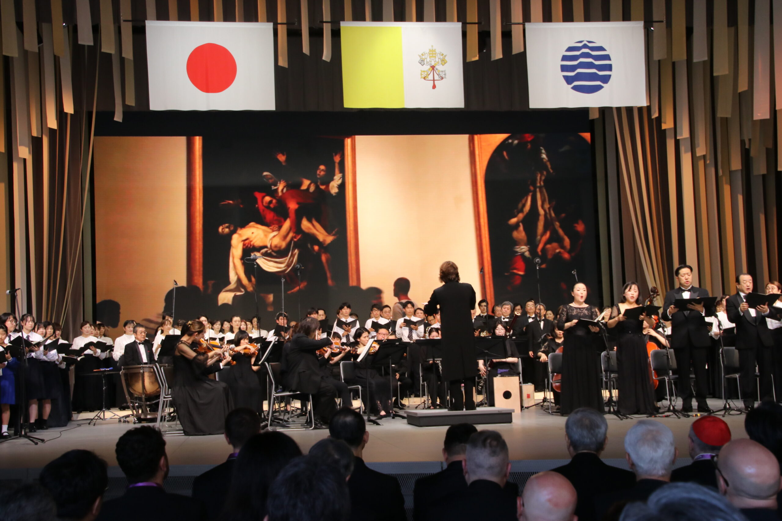 式典では、西本智美氏の指揮でモーツァルトのミサ曲「戴冠式ミサ ハ長調K.317」が演奏された。演奏者は、ソリスト、オーケストラ奏者、そして長崎、広島などから参加した児童、学生も含む合唱団員ら総勢150人以上。演奏中、壇上のスクリーンにはバチカンの聖ペトロ大聖堂や庭園、新教皇レオ14世が今年5月の教皇選挙で選出された直後にローマ市と全世界に向けて祝福を送った「ウルビ・エト・オルビ」の場面など、バチカンにまつわる建物や風景の写真がスライドで映し出された。