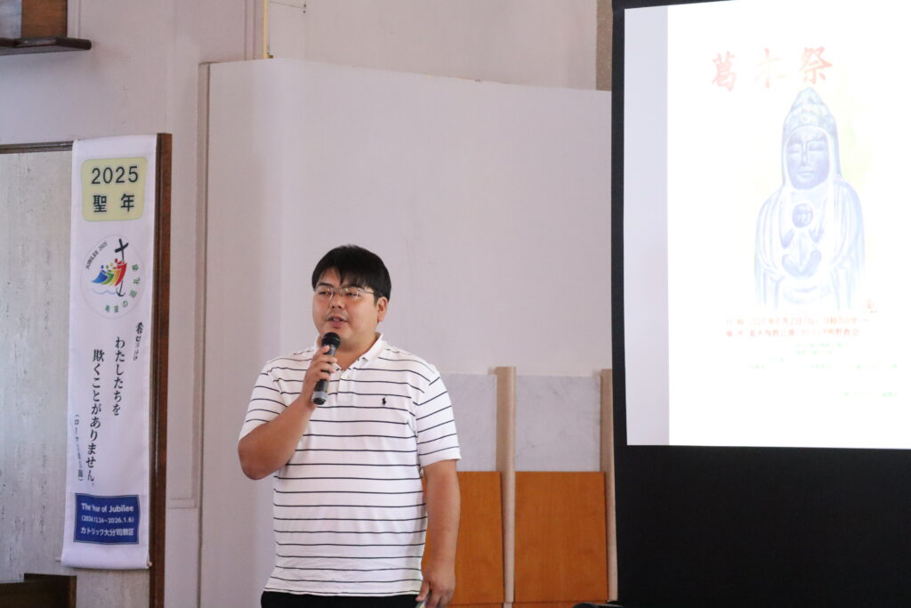 五つのキリシタン史関連の行事のうちの一つ、「葛木(かつらぎ)祭」について説明をしたのは萩本達也さん(32/坂ノ市〈さかのいち〉教会)。葛木祭は大分教会から車で20分ほどの「キリシタン殉教記念公園」で例年6月に開かれ、公園での祈りの後、明野(あけの)教会でミサが行われている。