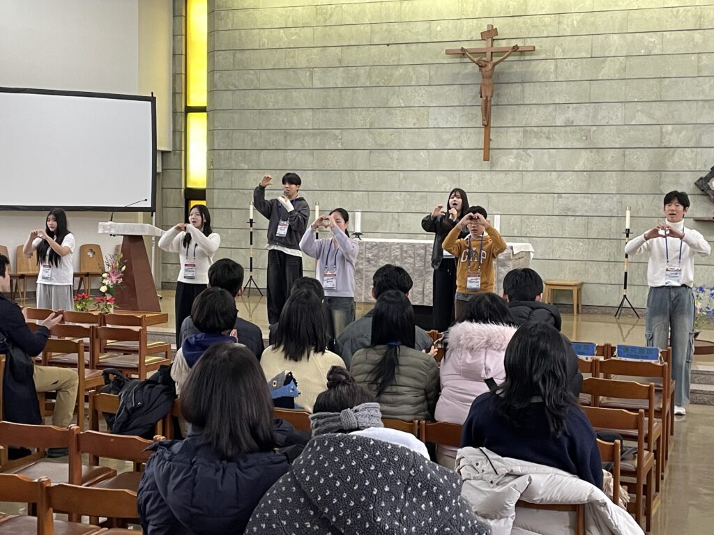 昼食後に聖堂で開かれた「青年のつどい」では、山野内司教が、今後、さいたま教区からも水原教区に青年を派遣し、27年のWYDソウル大会での交流につなげていきたいと話した。青年たちは互いに日本語、韓国語を織り交ぜてあいさつをし、韓国の中高生グループが日本語でのあいさつや、祈りを込めた歌とダンスを披露。参加者全員で聖歌『キリストの平和』を日本語で歌った。その後の交流会では、日本と韓国の茶菓を囲み、互いにスマホの翻訳アプリを駆使しながら共通の話題で盛り上がった。