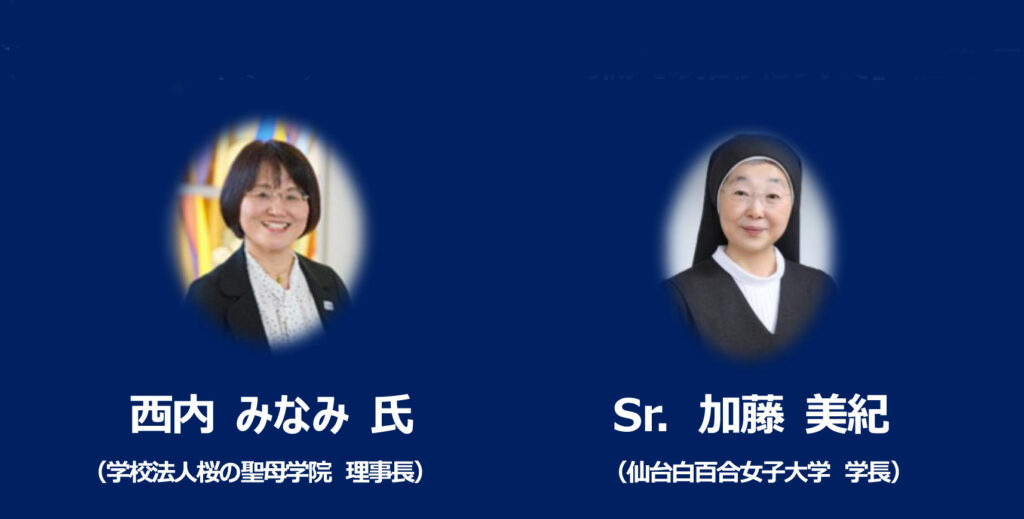 続けて、学校法人コングレガシオン・ド・ノートルダム・桜の聖母学院(設立母体・コングレガシオン・ド・ノートルダム修道会/福島市)の西内みなみ理事長と、仙台白百合女子大学(設立母体・シャルトル聖パウロ修道女会/仙台市)学長の加藤美紀修道女が話題を提供した。