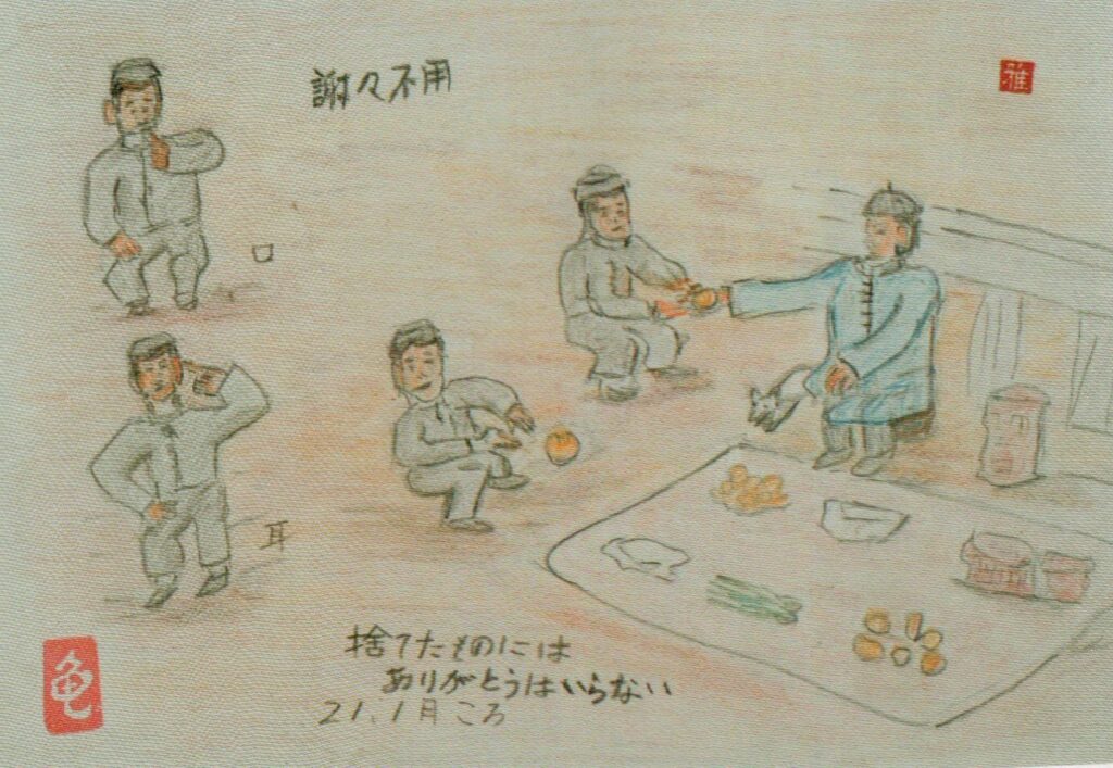 「その老人が『日本の子どもよ、来なさい』と言っているのが分かりました。私が恐る恐る近づくと、『ありがとうはいらないよ』と言って、まんじゅうを地面にぽんと投げてくれました。その老人は私が遠慮しないように、わざとまんじゅうを捨てたふりをして、捨てた物なのだから遠慮しないで食べなさいと声をかけてくれたのです。私はすぐにまんじゅうを拾い、夢中で食べました。本当においしいまんじゅうでした。その老人の優しさと、徳清君が教えてくれた中国語の言葉が私の命を救ったのです」