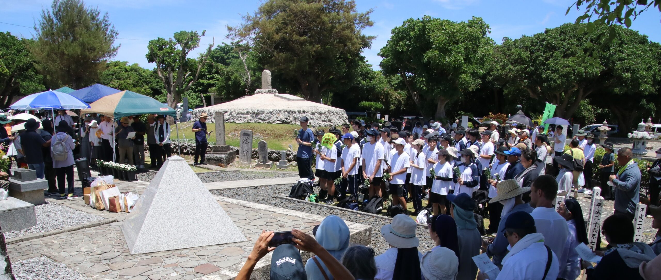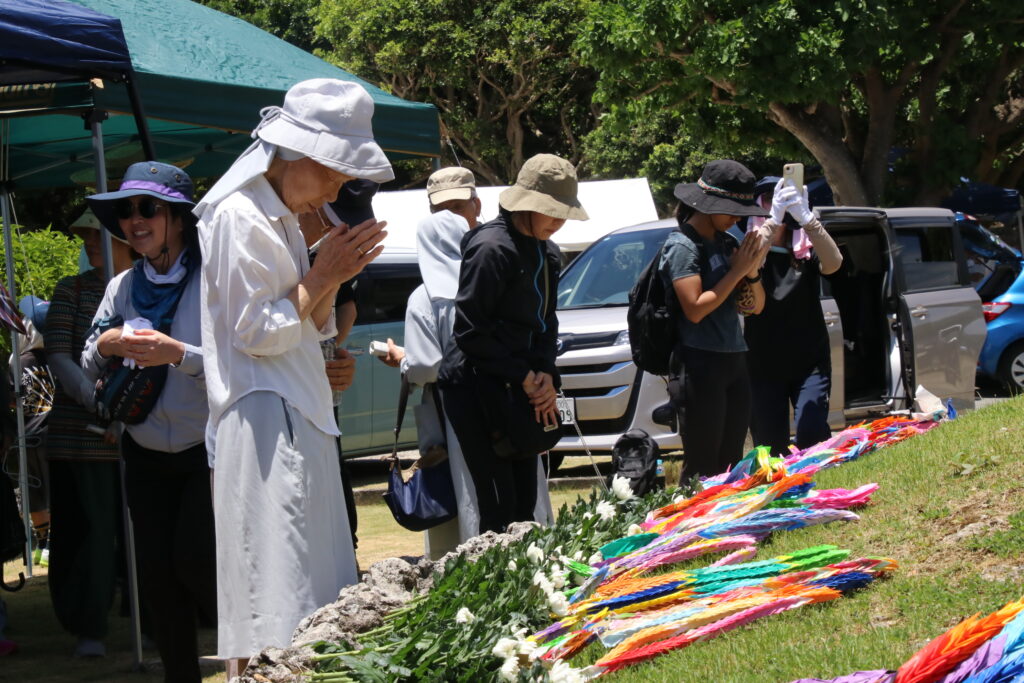 沖縄戦で組織的戦闘が終結したとされる沖縄「慰霊の日」の6月23日、那覇教区(ウェイン・バーント司教)は第39回「カトリック那覇教区平和巡礼」を開催した。終戦から80年を迎えた今年の平和巡礼には、世界平和の実現に力を尽くす誓いを新たにするため全国から13教区の司教も参加。住民を巻き込んだ激しい地上戦で20万人を超える人々が犠牲になった沖縄の人々と祈りを共にし、「もう二度と、武装しない させない」決意を新たにした。巡礼には約200人が参加した。