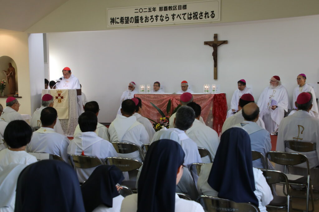 この日ミサを主司式した日本カトリック司教協議会会長の菊地功枢機卿(東京教区)は説教で、世界で戦争が続き、沖縄を含む南西諸島での軍備強化が進む中で、戦争の歴史からの教訓を忘れさせ、「美化」する動きがあることを指摘。特に若い世代に呼びかけることを目指した戦後80年の司教団メッセージ「平和を紡ぐ旅 ―希望を携えて―」が、沖縄の人々が叫び続けてきた平和や、核兵器廃絶を訴えていることを紹介し、平和のために声を上げ、行動していきたいと結んだ。