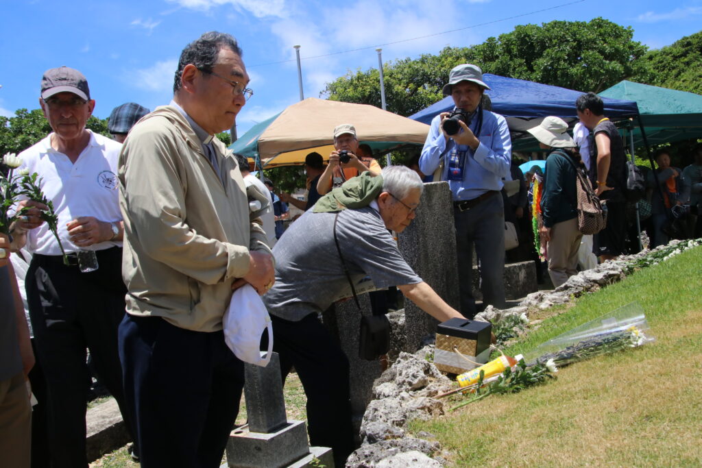 正午、沖縄県が主催する沖縄全戦没者追悼式の参加者など、この日、戦没者の慰霊と世界平和のために人々が行う1分間の黙とうに心を合わせた。その後、一人ずつ魂魄之塔の前に献花した。