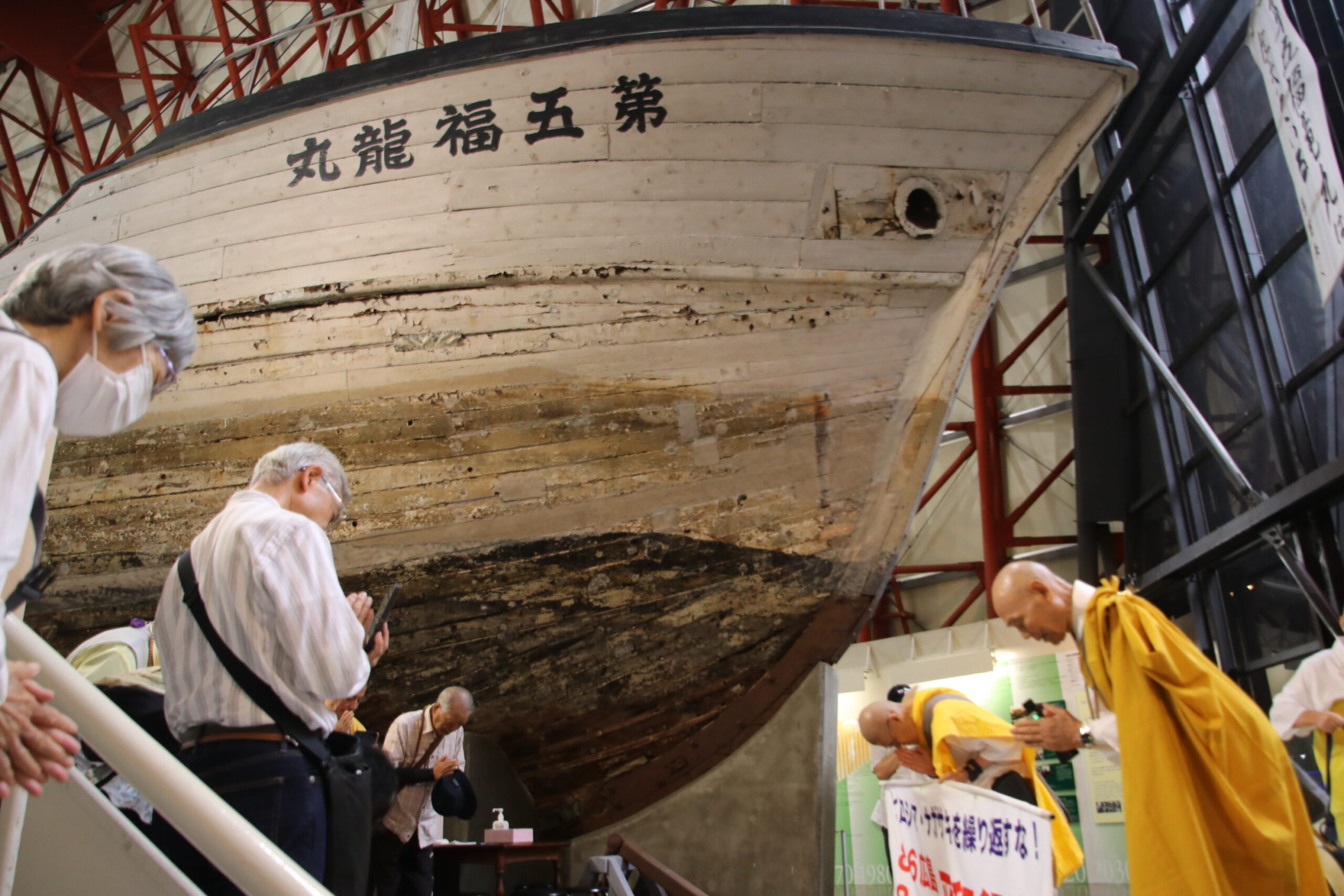 出発式会場に展示されている第五福竜丸は、1954年3月1日、米国が太平洋のマーシャル諸島ビキニ環礁(かんしょう)で行った水爆実験により被ばくした静岡県焼津(やいづ)港の遠洋マグロ漁船だ。実験から生じた放射性降下物「死の灰」により、全乗組員23人が被ばくした。