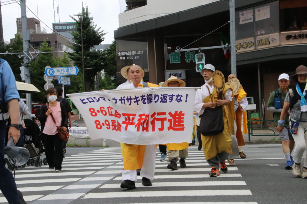 この平和行進は1958年、東京から徒歩で行進し、広島で平和祈念を行う形で始まった。以来、目的地に長崎を加えたり、僧侶の高齢化に伴って移動に公共交通機関を利用したりするようになるなど変化もしながら、67年続いてきた。カトリック教会も小教区単位や信者個人でこの行進に協力し、今年も岡山県の玉島教会、広島県の福山、三原教会の3教会が行進参加者に宿泊所を提供する。日本山妙法寺の江上彰(あきら)上人(しょうにん)は、「(平和行進に)個人的に参加・協力してくださる(信徒の)方もいますし、滞在した教会の聖堂で私たち(僧侶)が信者さん方と聖歌を歌う姿を見て、驚く方もいらっしゃいますよ」と言う。