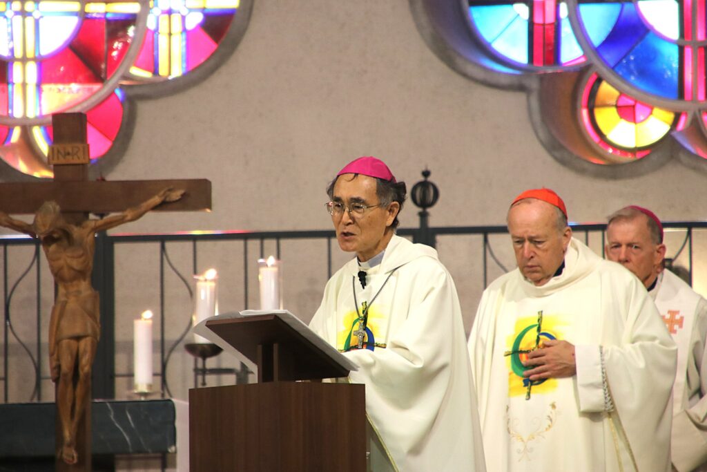 6日朝の「原爆とすべての戦争の犠牲者のためのミサ」(→関連記事)は白浜司教が主司式。ミサ説教は米シカゴ教区のブレーズ・スーピッチ枢機卿が担当し、200人余りが心を合わせた。