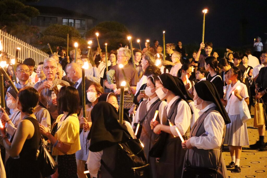 ミサの後、信者たちはたいまつを持って、爆心地公園まで祈りながら歩いた。