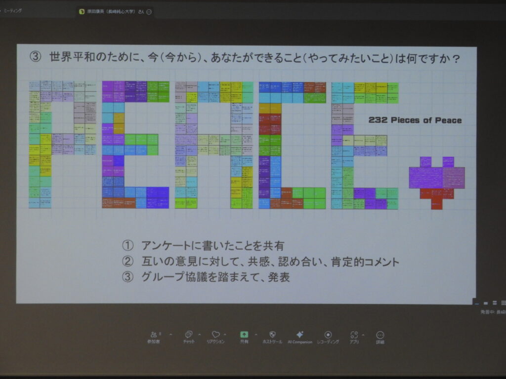 純心聖母会が運営する恵の丘長崎原爆ホームの利用者2人から直接、被爆体験を聞き、学生たちがグループで感想を発表した。同大学の在学生と教員、卒業生によるパネルディスカッションと、小グループに分かれての対話の時間も持たれ、平和実現のために自分たちはこれから何ができるのか、思いを語り合った。