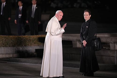 会場を去る教皇フランシスコと、その通訳を務めたレンゾ・デ・ルカ神父。