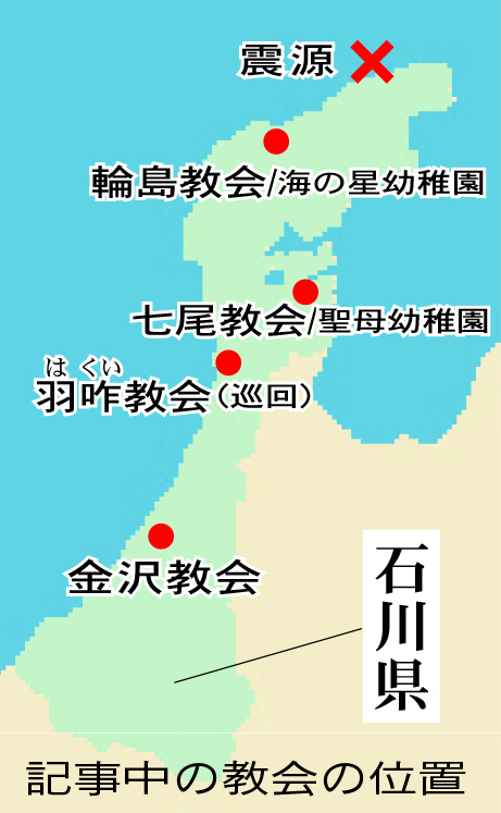 「金沢も相当、揺れた(震度5弱)」が、予定通り休みを取れるよう、片岡神父は司牧を担当している七尾教会と、能登半島北部の輪島教会(石川県輪島市)の状況を見に行くことにした。