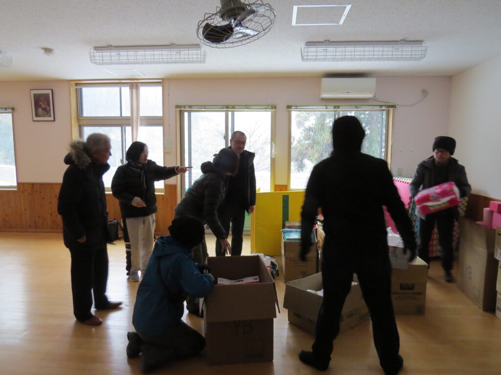 園のホールに物資を運び込むERSTら支援者たち(2024年1月7日)