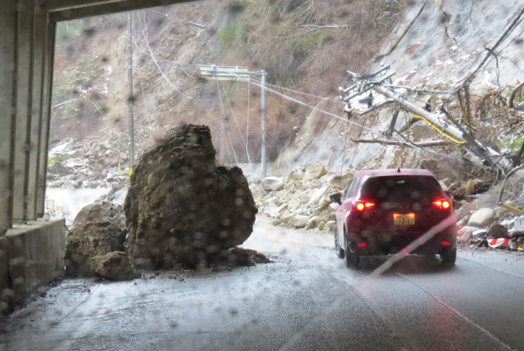 車で金沢市中心部を抜けると、事の重大さが見えてきた。いつも使っている自動車道は入口の手前で土砂が崩れ、通行できなくなっている。友人からは、寸断された自動車道の写真がメールで届いた。往生していると、金沢の小教区を一緒に司牧している九里(くのり)彰神父(カルメル修道会)から電話が入った。「もう暗くて危険だから、帰ってくるように」と九里神父に諭され、この日は金沢へ引き返すことにした。