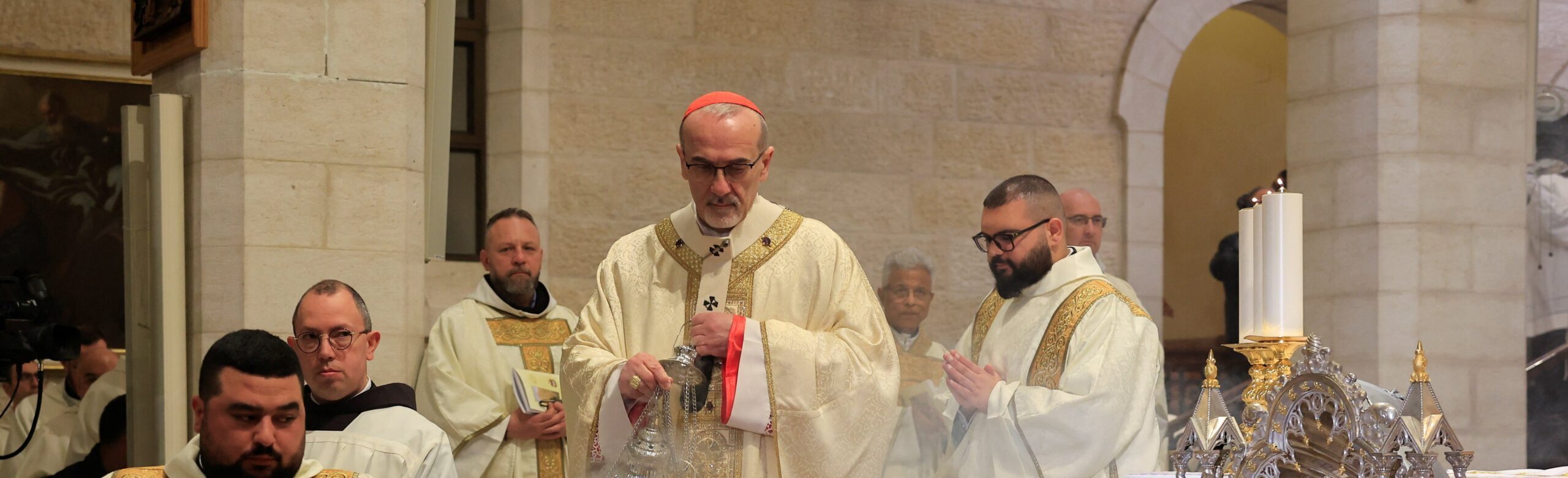 2025年12月25日、ベツレヘムの聖誕教会大聖堂の北側に隣接する聖カタリナ教会でクリスマスの夜半のミサをささげるラテン典礼エルサレム総大司教のピエルバッティスタ・ピッツァバッラ枢機卿 (OSV News photo/Mussa Qawasma, via Reuters)