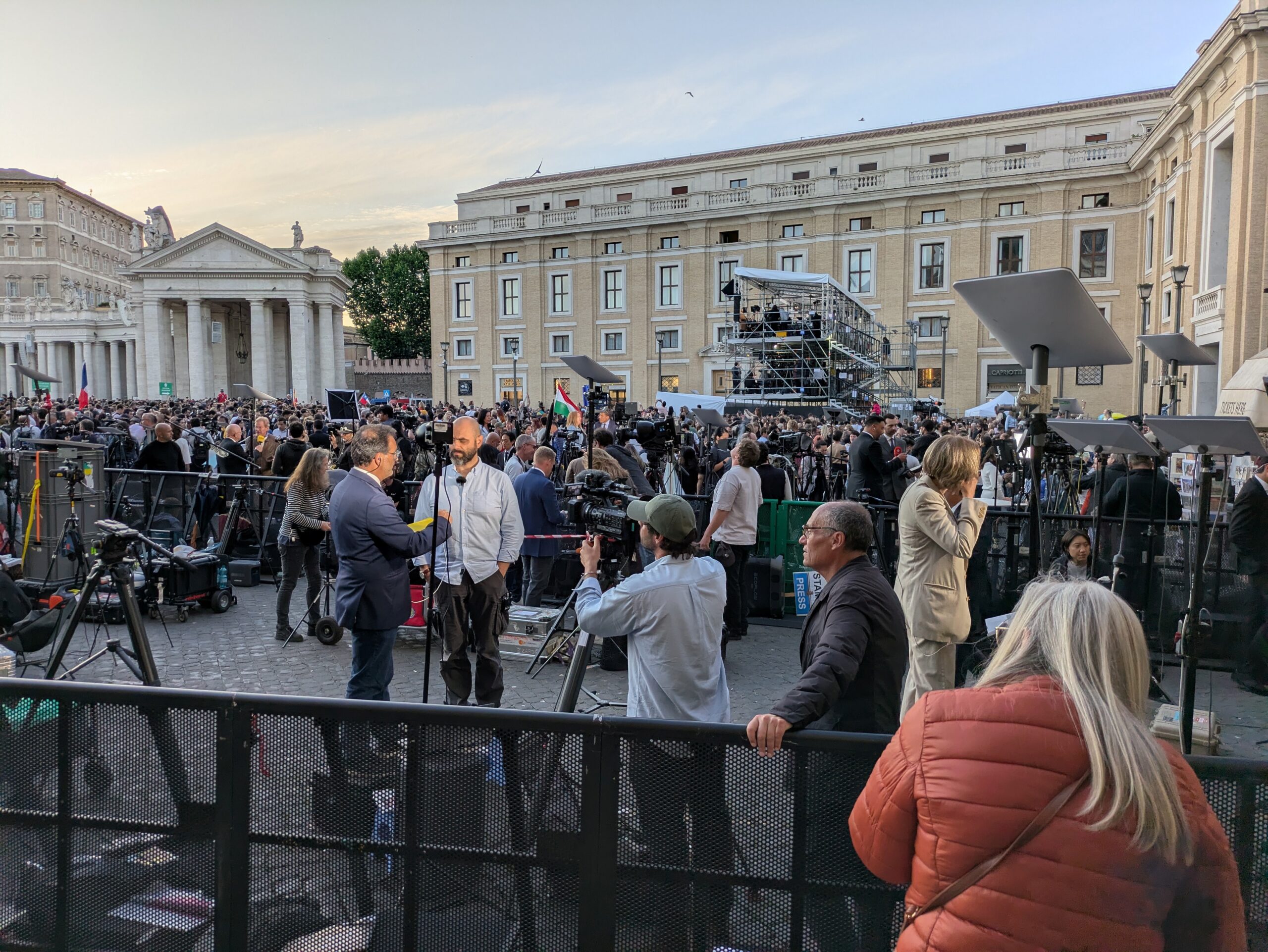 サンピエトロ広場の大型モニターには、各国の国旗を振る群衆やシスティーナ礼拝堂に設置された煙突が映し出され、上空にはドローンが飛ばされて、新教皇選出の瞬間に向け準備万端整っていた。煙突近くに白いカモメが舞い降りる映像が流れると、白煙を待ち望む群衆からは期待を込めた歓声と拍手が湧き起こる。