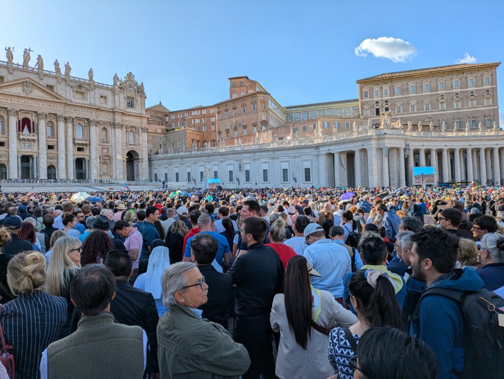 発表を待つ間、近くにいたイタリア人は教皇選出を告げる「アンヌンツィオ・ボービス…(皆様にお知らせします…)」を真似して周囲の笑いを誘っていた。そして本物の「アンヌンツィオ・ボービス…」が告げられると、「パーパ・レオーネ(教皇レオ)! パーパ・レオーネ!」「ビーバ・イル・パーパ(教皇様万歳)!」の叫びが広場のあちらこちらから繰り返された。その後、バルコニーに現れた新教皇の最初のあいさつと祝福は周知のとおりである。大型モニターに映るレオ14世は、湧き起こる歓声と拍手に少し涙ぐんでいるようにも見えた。