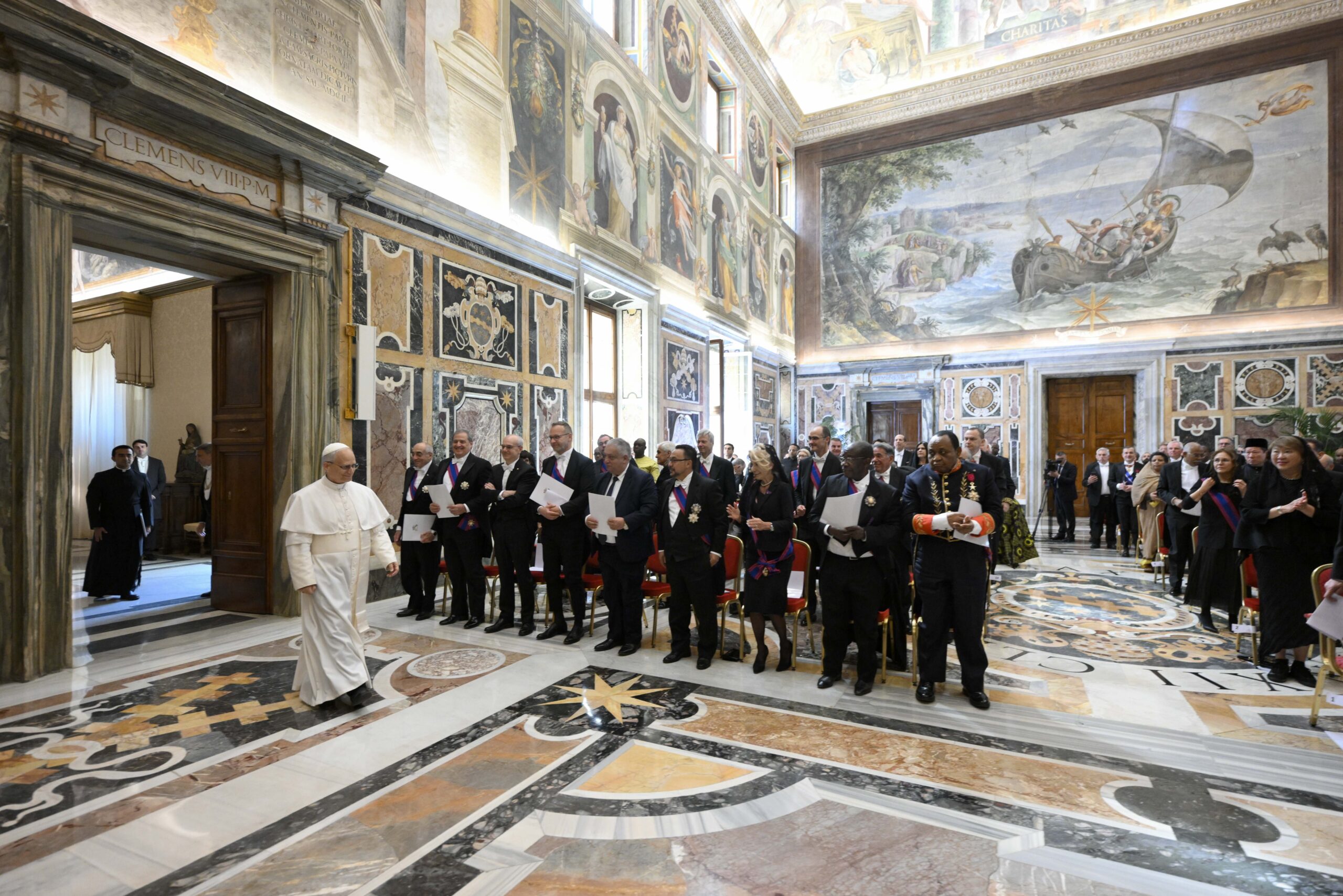 教皇レオ14世は、バチカン使徒宮殿のクレメンスの間での外交使節団に向けたあいさつで、こう付け加えた。「宗教と諸宗教対話は、平和への機運を高める上で根本的な貢献ができます」