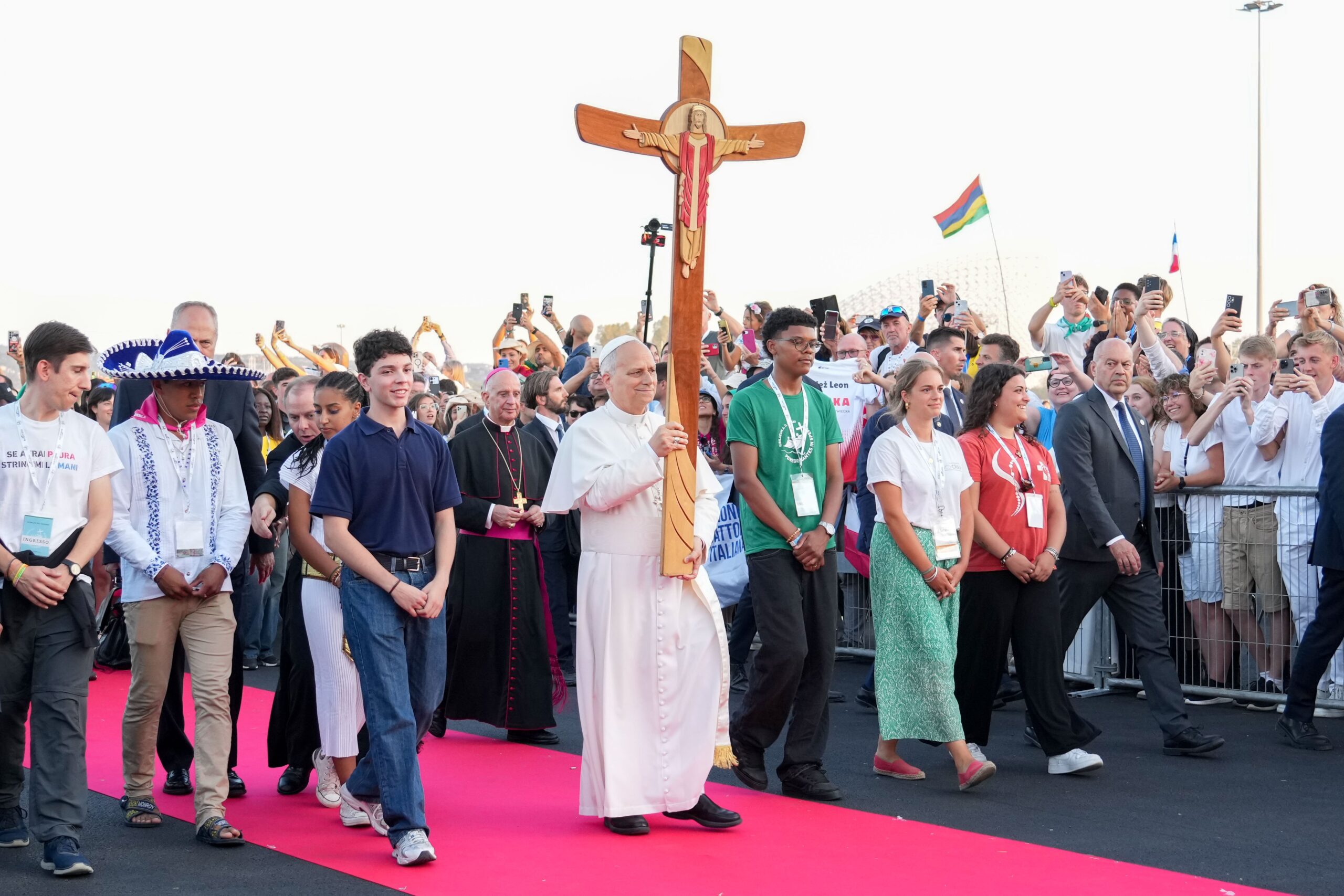 教皇レオ14世は、パパモービレ(教皇専用車)で広場の中を巡り、若者たちにほほ笑みかけながら、手を振って回った。