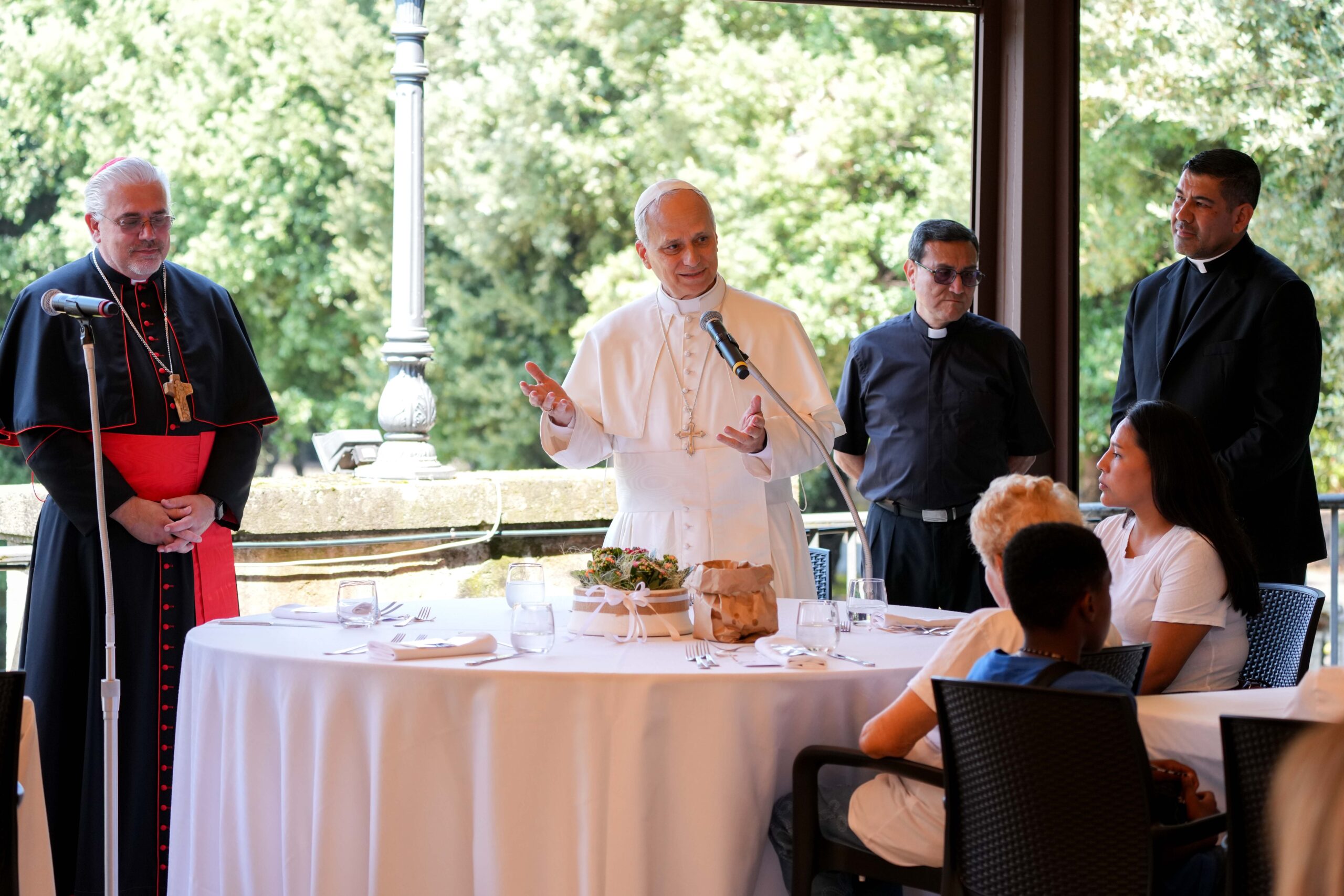 教皇レオ14世は丸テーブルに着いて、同席したのはペルーからの移住者で夫と子どもたち2人を伴っていたロサバル・レオンさんとローマ郊外で一人暮らしをしている85歳のガブリエッラ・オリベイロさんだった。