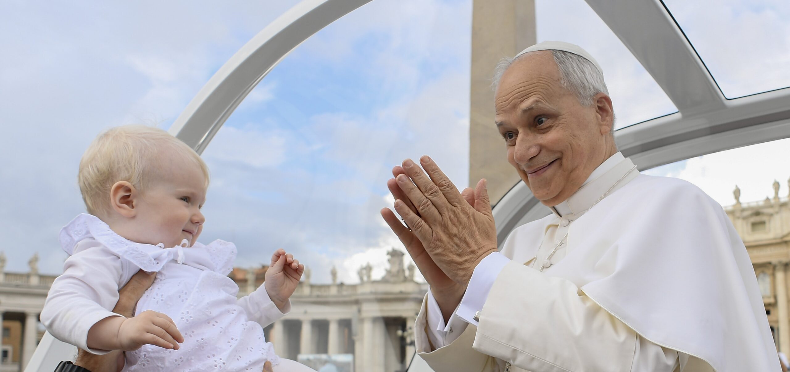 9月24日、バチカンのサンピエトロ広場で開いた一般謁見の前に、パパモービレ(教皇専用車)で広場を巡り、赤ちゃんにあいさつする教皇レオ14世(CNS photo/Vatican Media)