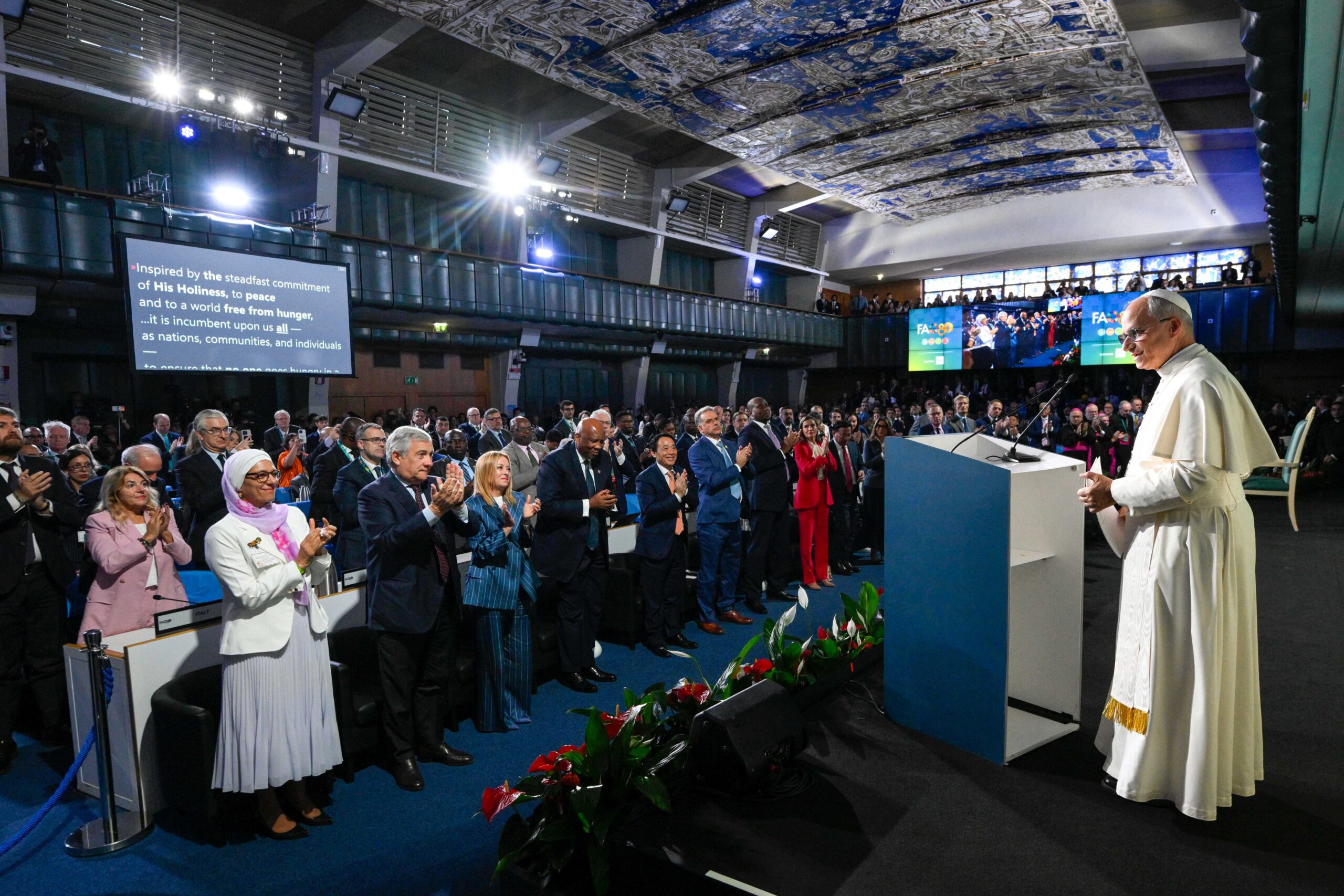 教皇は同日、ローマの国連食糧農業機関(FAO)の本部を訪れ、世界の指導者や各国政府代表を前に演説した。FAOは当日、設立80年を式典で祝っていた。