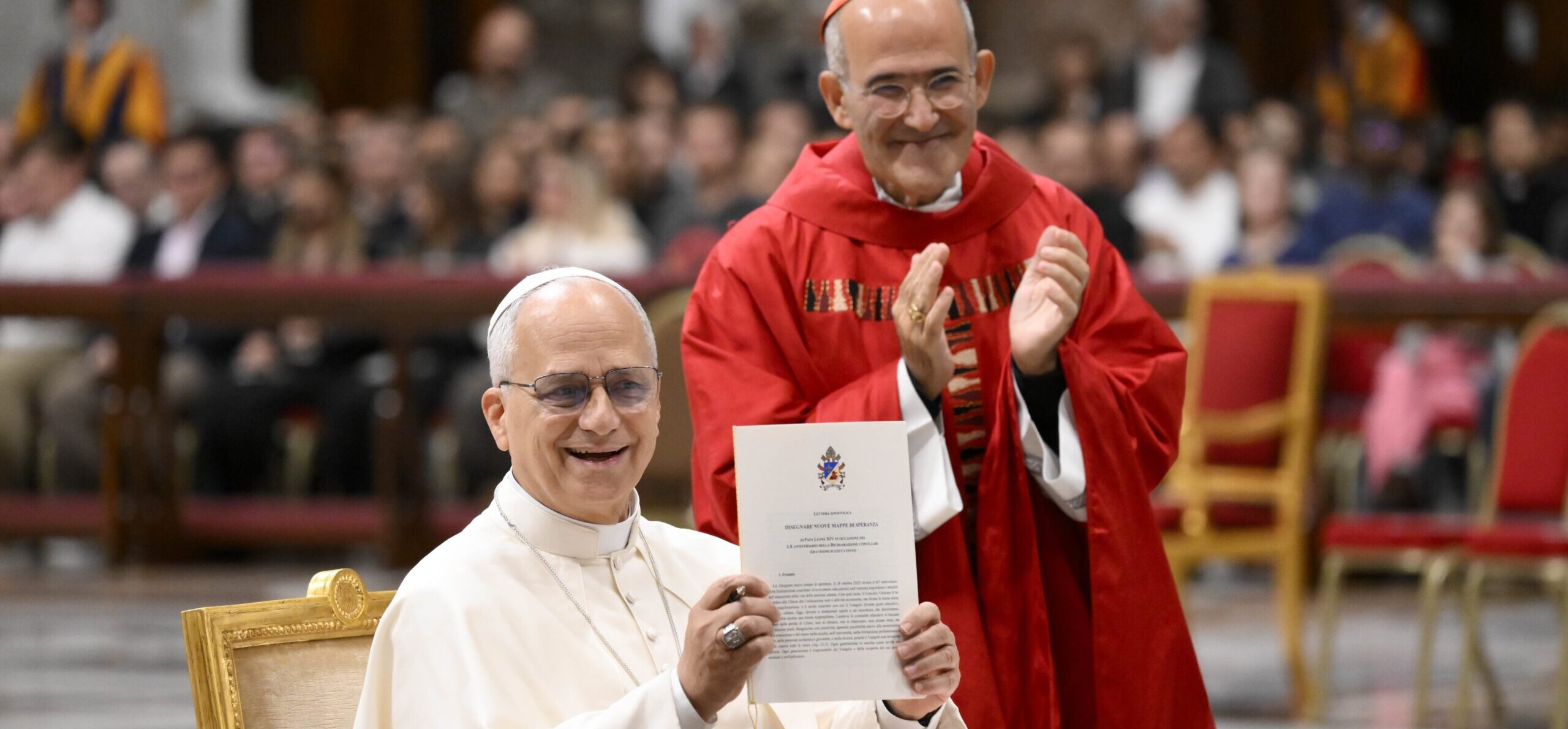 教皇レオはミサの前に祭壇前に用意された机に向かい、第2バチカン公会議文書『キリスト教的教育に関する宣言』の発表60年を記念する使徒的書簡「新しい希望の地図を描く」に署名した。
