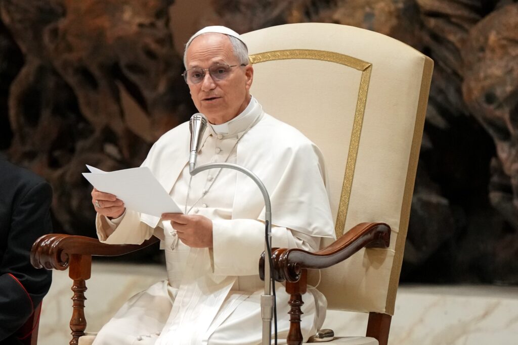 1月28日、バチカンのパウロ6世ホールで、一般謁見に集まった巡礼者と訪問客に語りかける教皇レオ14世 (CNS photo/Lola Gomez)