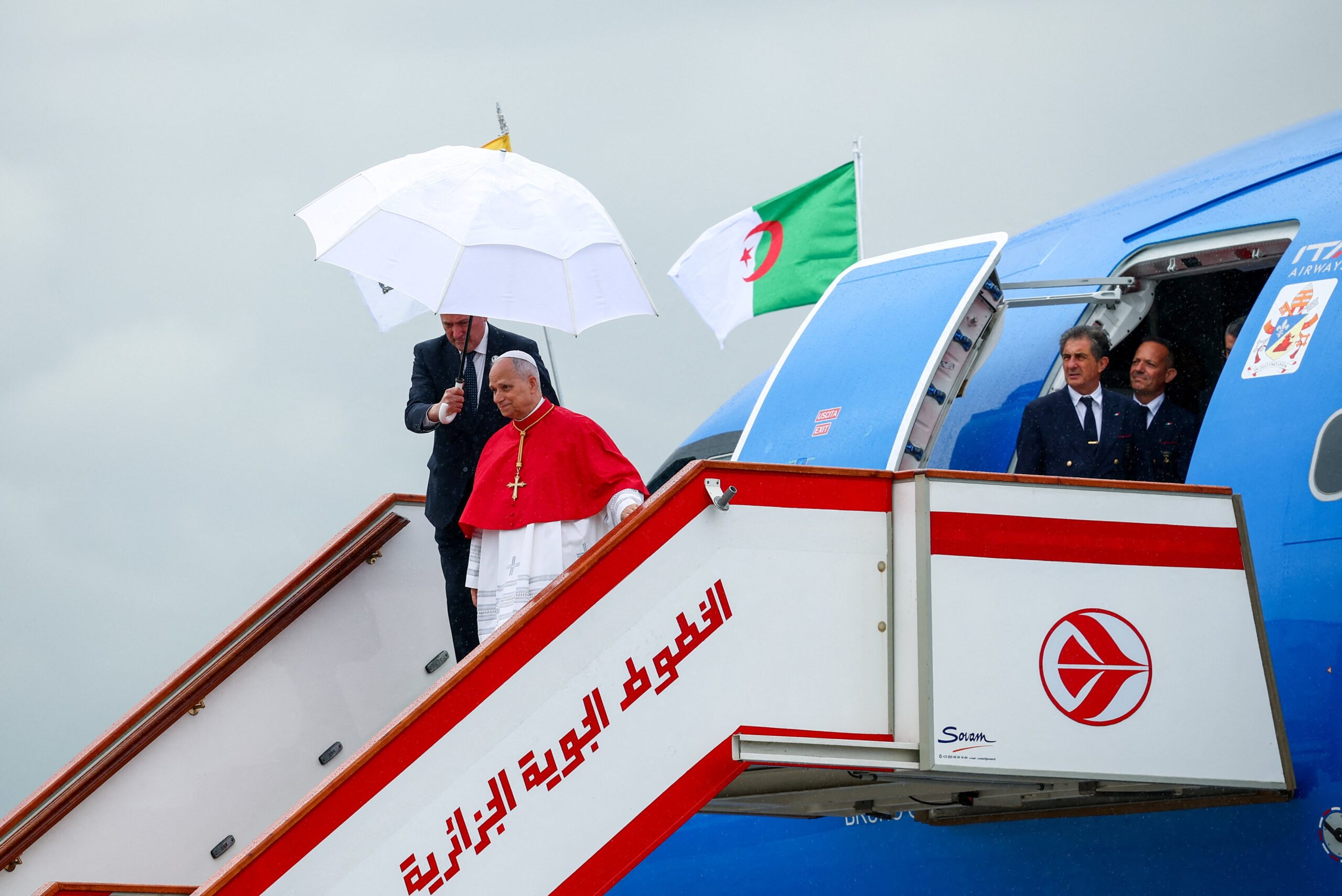 教皇が搭乗した飛行機は、ローマから2時間後の現地時間午前10時少し前に、首都アルジェにあるウアリ・ブーメディアン空港に着陸した。大雨の予報のため、屋外で予定されていた歓迎式典は、屋内で執り行われた。