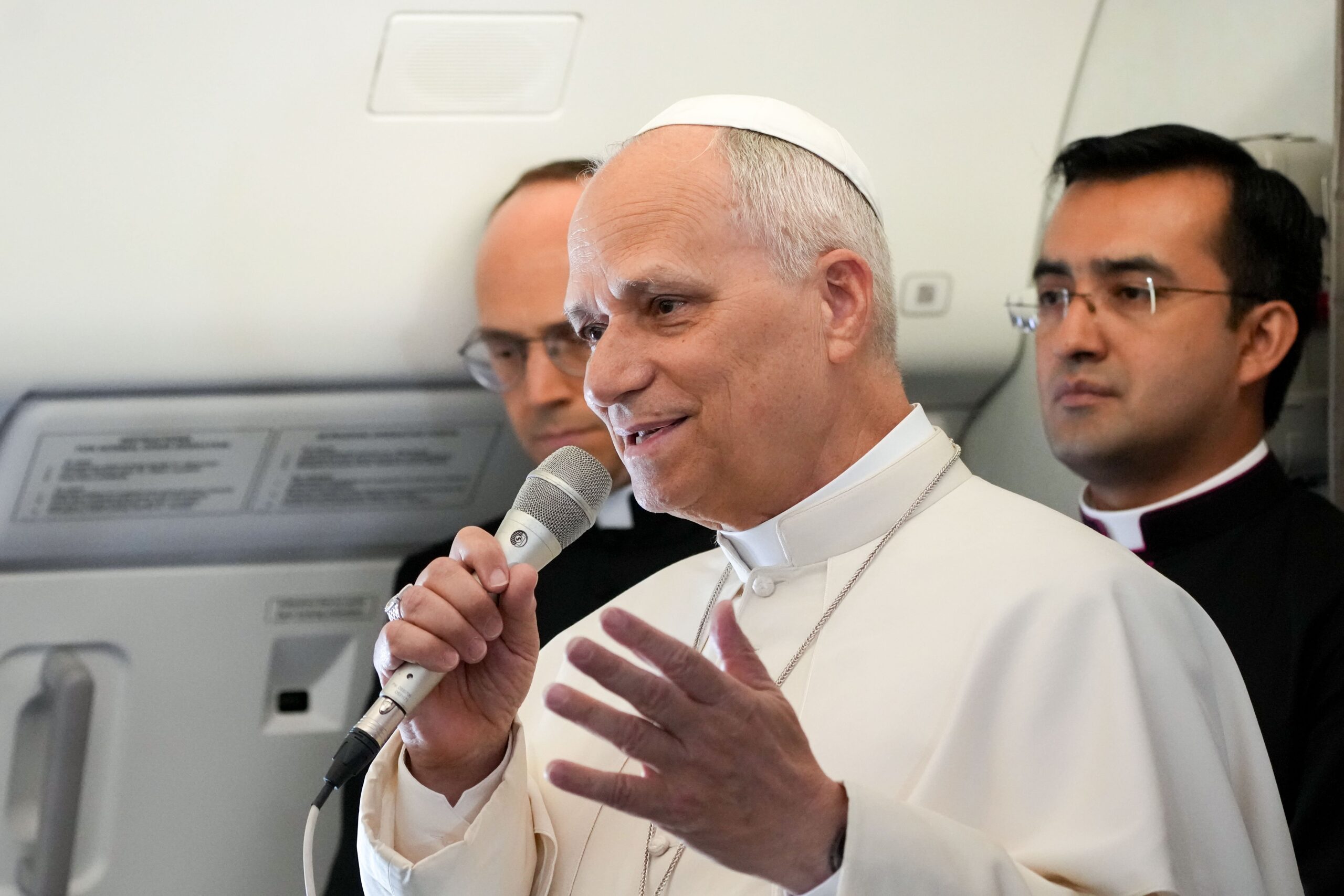 教皇、移動の機中で記者会見 前教皇フランシスコをしのぶ